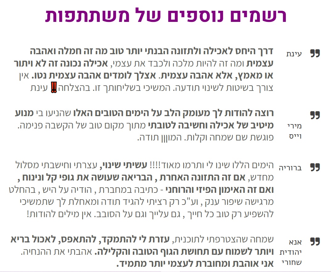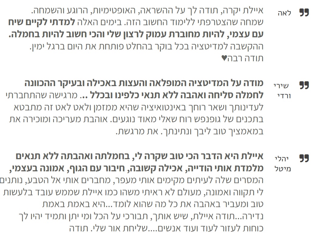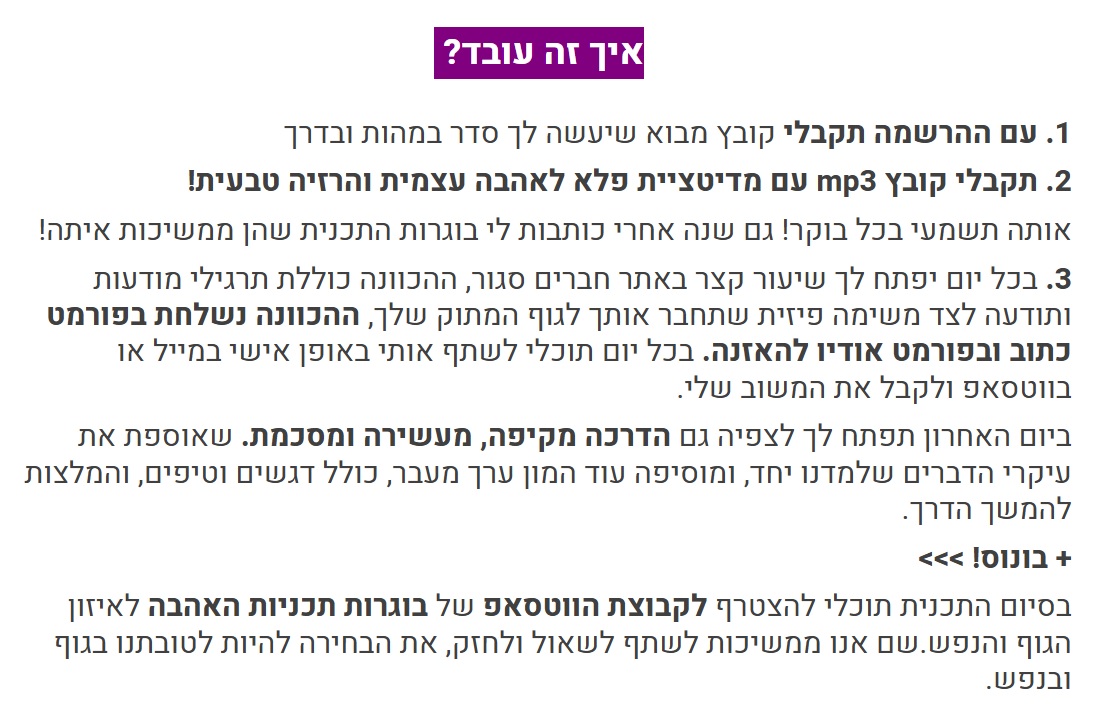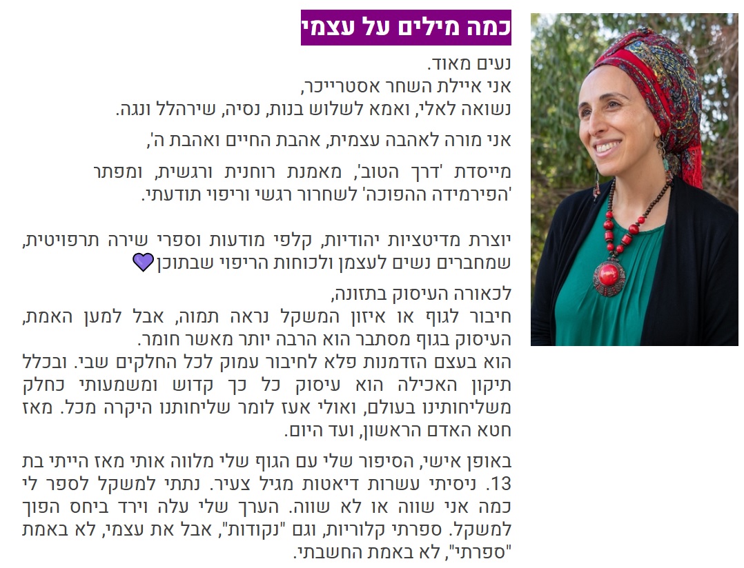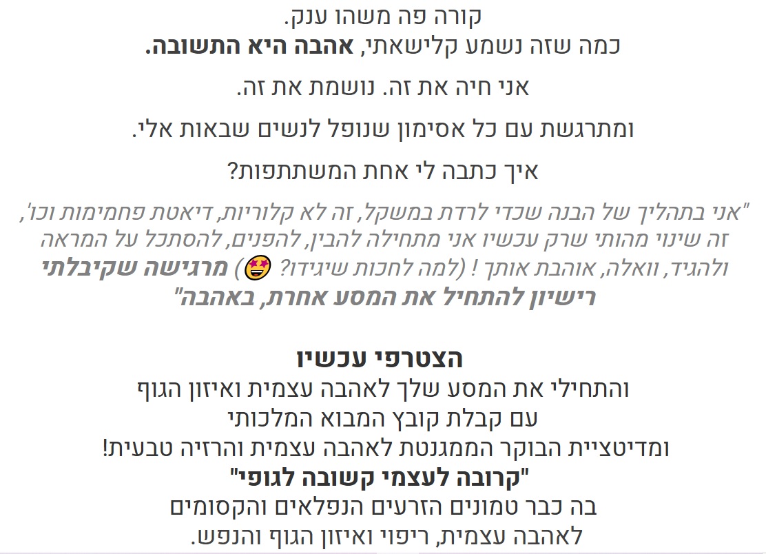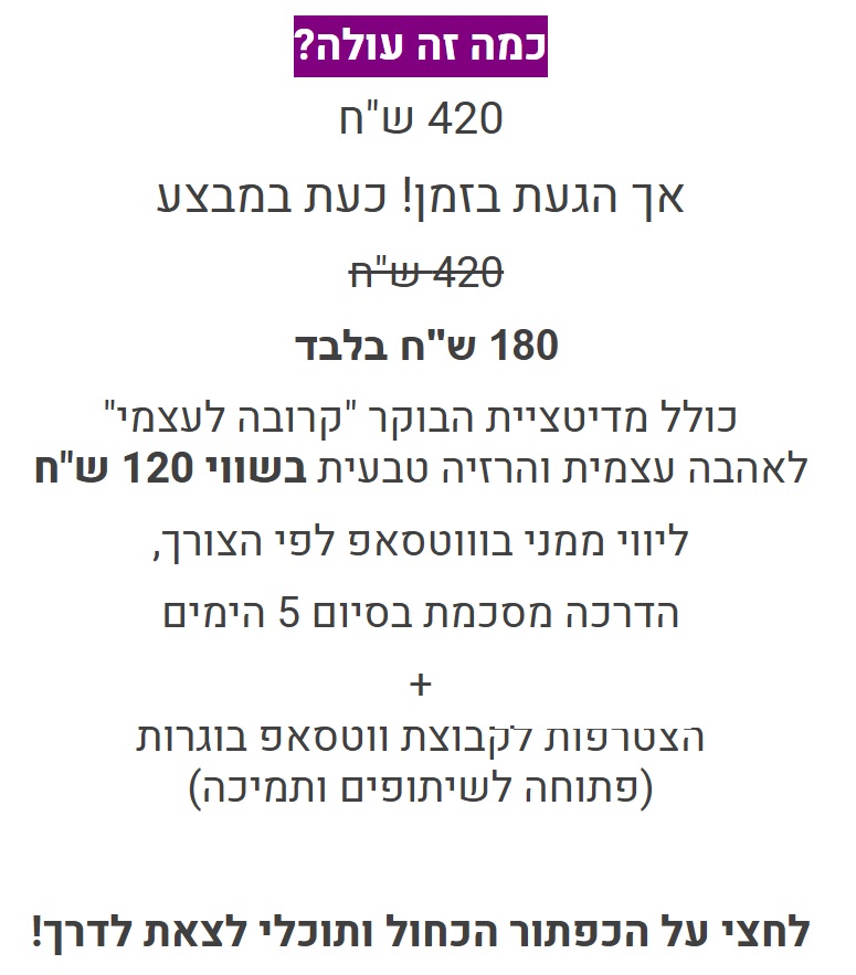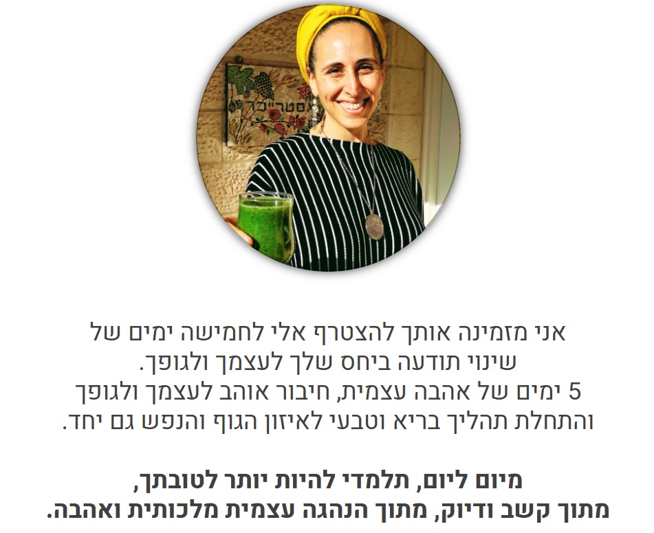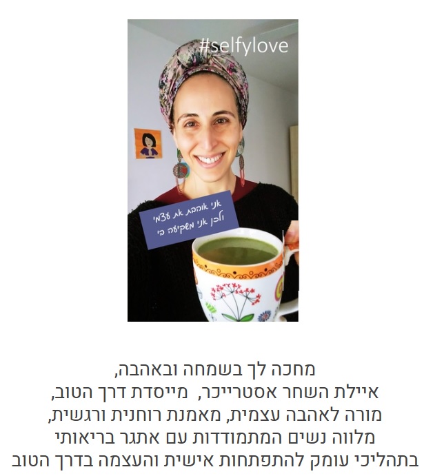 דיאטת אהבה ב5 ימים חמישה ימי אהבה עצמית תיקון האכילה ואיזון טבעי של הגוף והנפש בהנחיית איילת השחר אסטרייכר מדרך הטוב כולל מדיטציית פלא ייחודית לשינוי תודעה, אהבה עצמית והרזיה טבעית, ללא דיאטה, ללא מאבק, ללא אשמה. ניתן לשלם גם בביט או פייבוקס למספר שלי 054-444-271